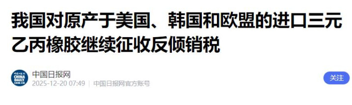 最为引东说念主闪耀的,是来自商务部的第三说念“实锤”。在社交和军事层面的严厉表态以外,并吞天,中国商务部发布公告,晓示对原产于好意思国的入口三元乙丙橡胶发起的反推销步履进行期终复审访谒。说白了即是对好意思国的反推销税络续征收。