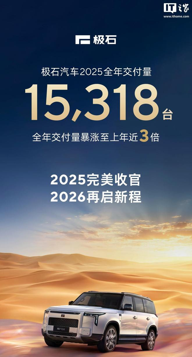 据IT之家此前报谈,在2025年12月28日的极石汽车品牌策略及新车上市发布会上,极石汽车承接首创东谈主兼首席实践官闫枫秘书,2026年大家销量宗旨3万辆,并蓄意在2030年景为“大家户外青睐者的首选新动力品牌”。